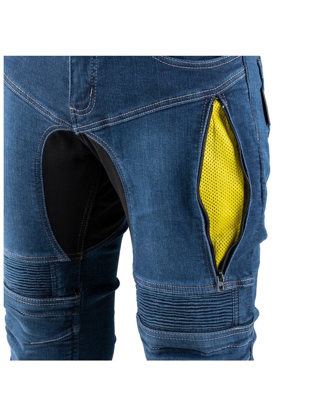 Dále jsou džíny vybaveny vyjímatelnými chrániči boků a kolen s velkou plochou, čímž je ještě zvýšen stupeň bezpečnosti. Ty kolenní lze jednoduše vkládat zvenku, tudíž se nemusíte obávat jejich zdlouhavé výměny nebo dokonce obracení kalhot naruby. K tomu jsou navíc ještě výškově nastavitelné, takže jistě padnou každému. Po vyjmutí protektorů lze jeansy bez jakéhokoliv problému používat i jako normální kalhoty ke každodennímu nošení.