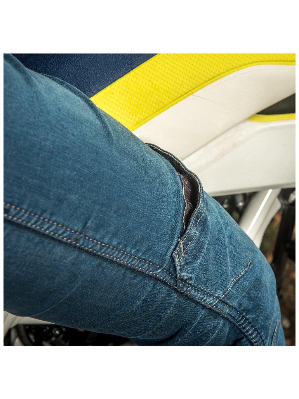 Dále jsou kalhoty vybaveny vyjímatelnými chrániči boků a kolen s velkou plochou, čímž je ještě zvýšen stupeň bezpečnosti. Ty kolenní lze jednoduše vkládat zvenku, tudíž se nemusíte obávat jejich zdlouhavé výměny nebo dokonce obracení kalhot naruby. K tomu jsou navíc ještě výškově nastavitelné, takže jistě padnou každému. Po vyjmutí protektorů lze jeansy bez jakéhokoliv problému používat i jako normální kalhoty ke každodennímu nošení.
