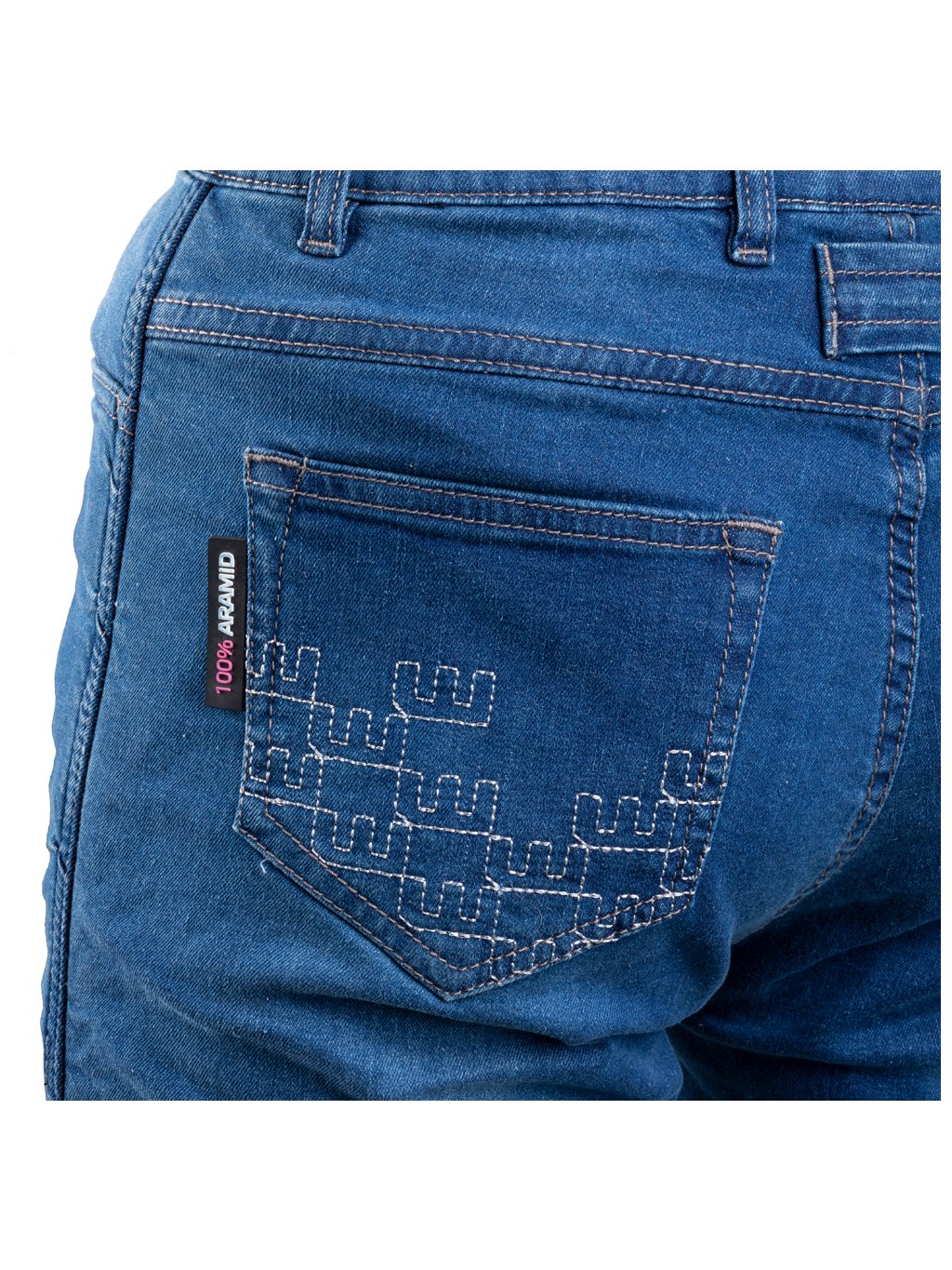 - materiál: vnější 11,5 oz bavlněný denim (98%), elastan (2%); podšívka 60% aramidové vlákno/40% polyester (na cca 60% povrchu), bavlna