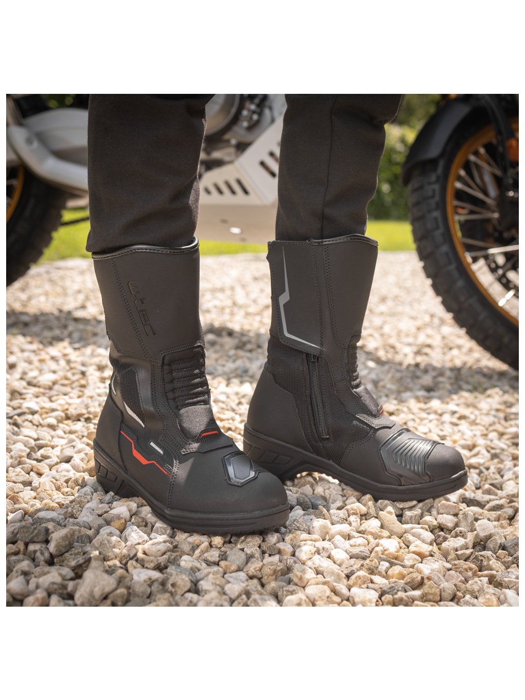 Boty se zapínají pomocí kvalitního YKK zipu na boční straně, jištěného suchým zipem - takže žádné zdržování, když chcete být rychle na cestě. Přední a zadní pružné panely se přizpůsobí pohybu, a vícedílný zadní panel zajistí, že se boty přizpůsobí vašim křivkám. Tyto moto boty jsou do každého počasí - díky voděodolné membráně zůstanou vaše nohy v suchu a pohodě, i když vám počasí právě nepřeje. V letních dnech zase oceníte boční ventilační panely, které zajistí příjemné klima a reflexní prvky se postarají o to, že budete vidět, i když slunce zapadne za obzor dřív než vypneš motor.