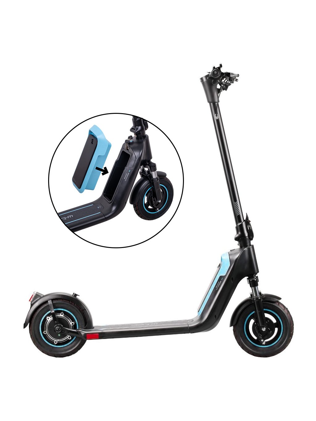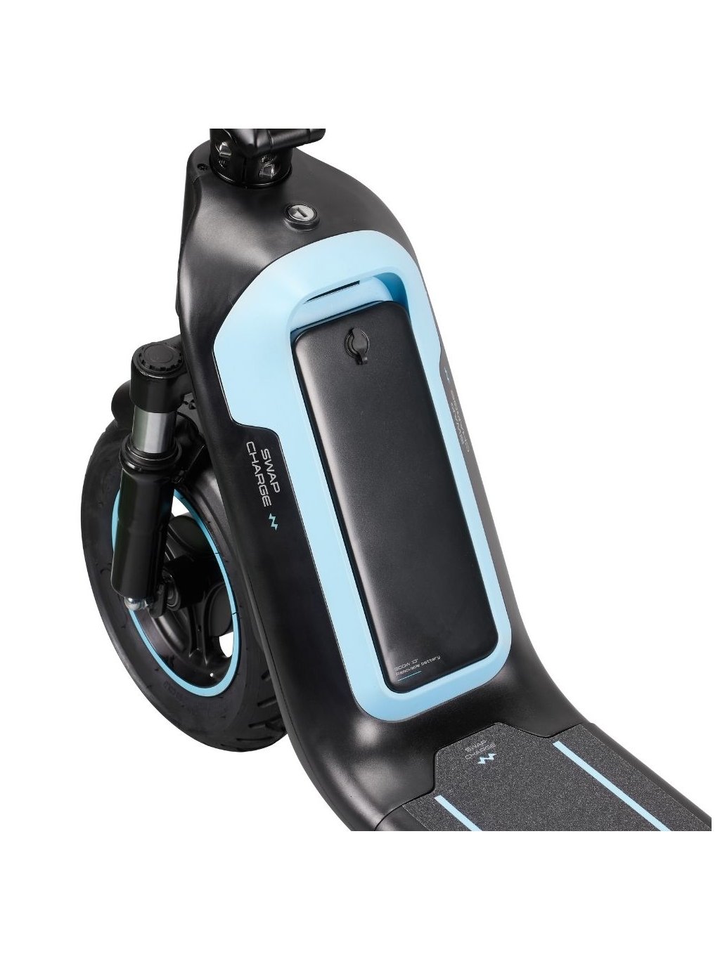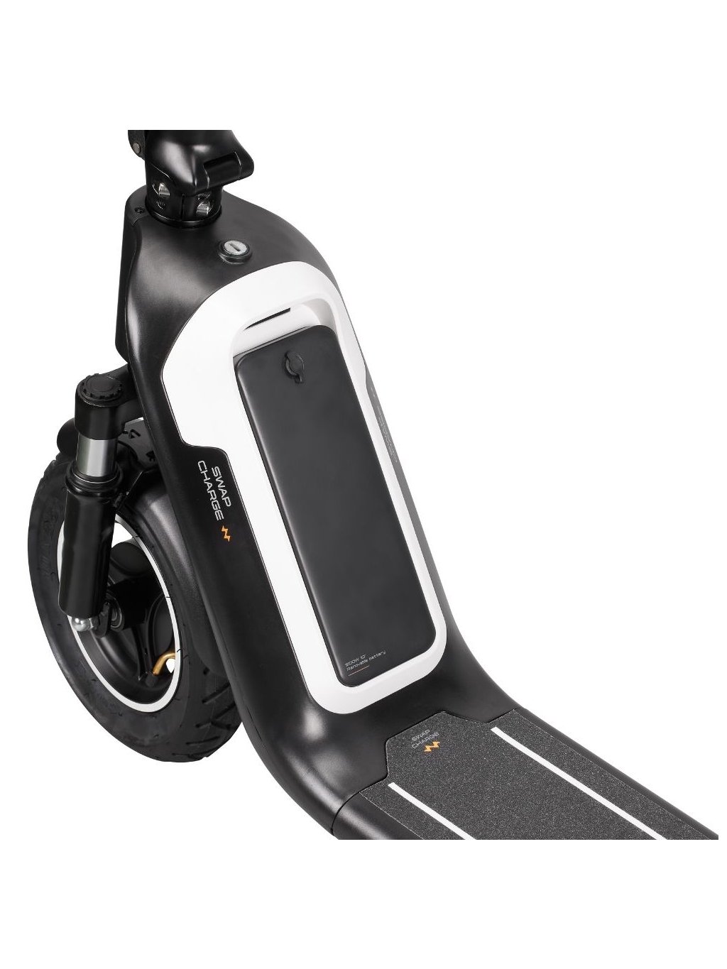 Tady to funguje jinak - baterie je chytře umístěná přímo pod řídítky a během pár vteřin ji odemknete, vycvaknete a vezmete si ji s sebou - stylové "grap and go" v praxi. Do bytu, do kanceláře, do kavárny... prostě kamkoliv. Nemusíte koloběžku nikam vynášet ani s ní složitě manipulovat. Klidně si můžete dát kafe a vyřídit e-maily, zatímco se baterie nenápadně dobíjí vedle vás.