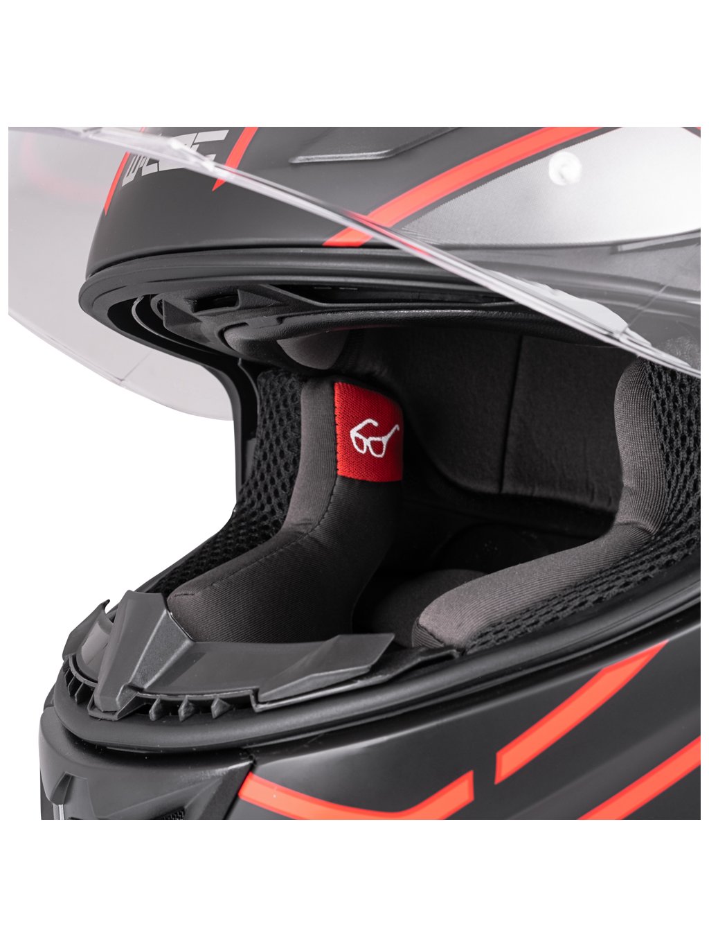 Široké odklopné hledí s přípravou pro Pinlock® folii poskytuje dokonalou ochranu pro oči a velký zorný úhel. To vše je doplněné o samostatně výsuvnou sluneční clonu, která chrání proti ostrému slunečnímu záření během jízdy. Lze jí pohodlně ovládat z vnějšku pomocí páčky na boku helmy. Navíc si do helmy můžete vzít i své dioptrické brýle, aniž by Vás tlačily. A je myšleno i na motorkáře, kteří vyráží v partě a chtějí komunikovat mezi sebou za pomoci interkomu. Pro jeho sluchátka je také připraven prostor.