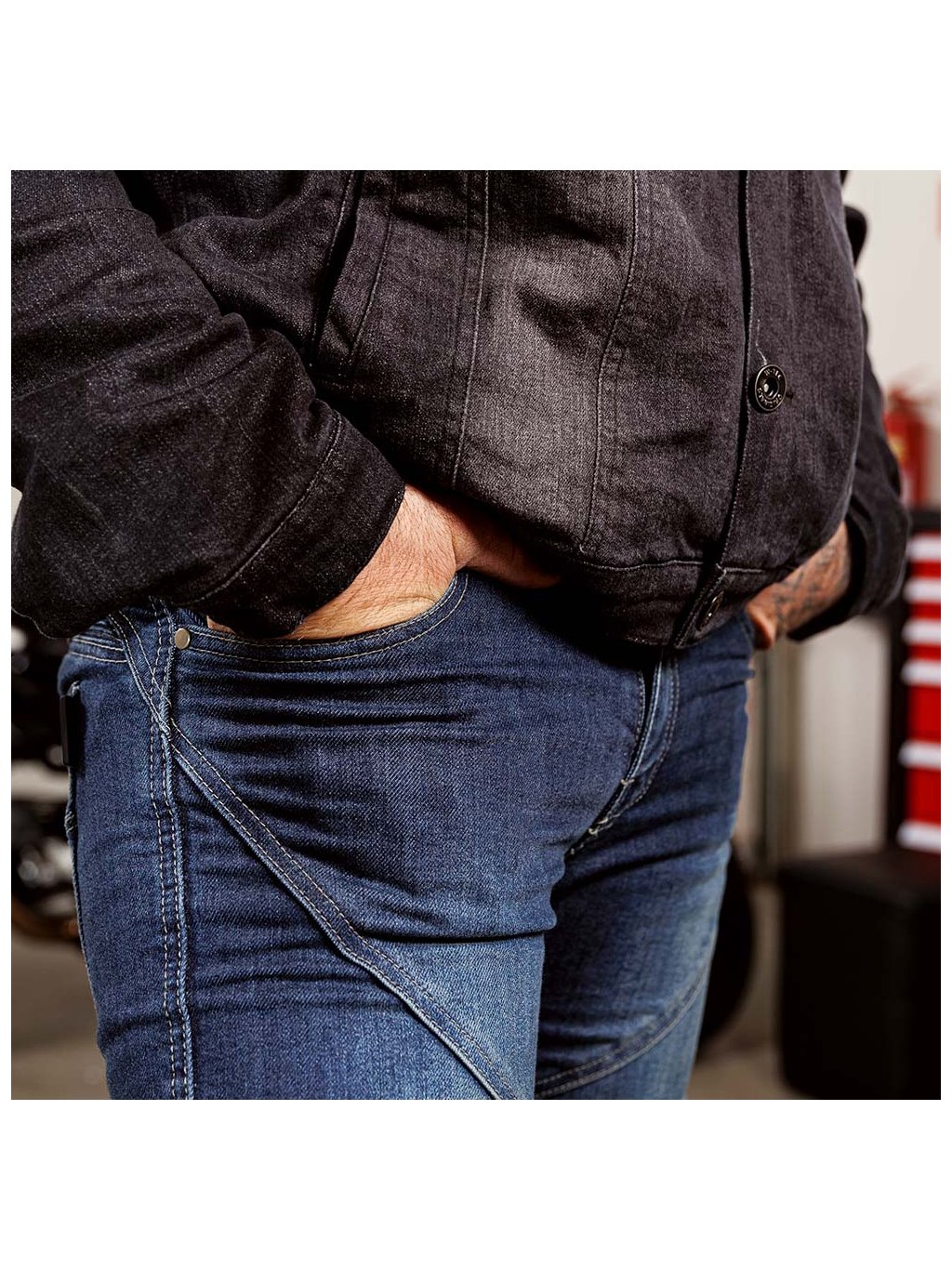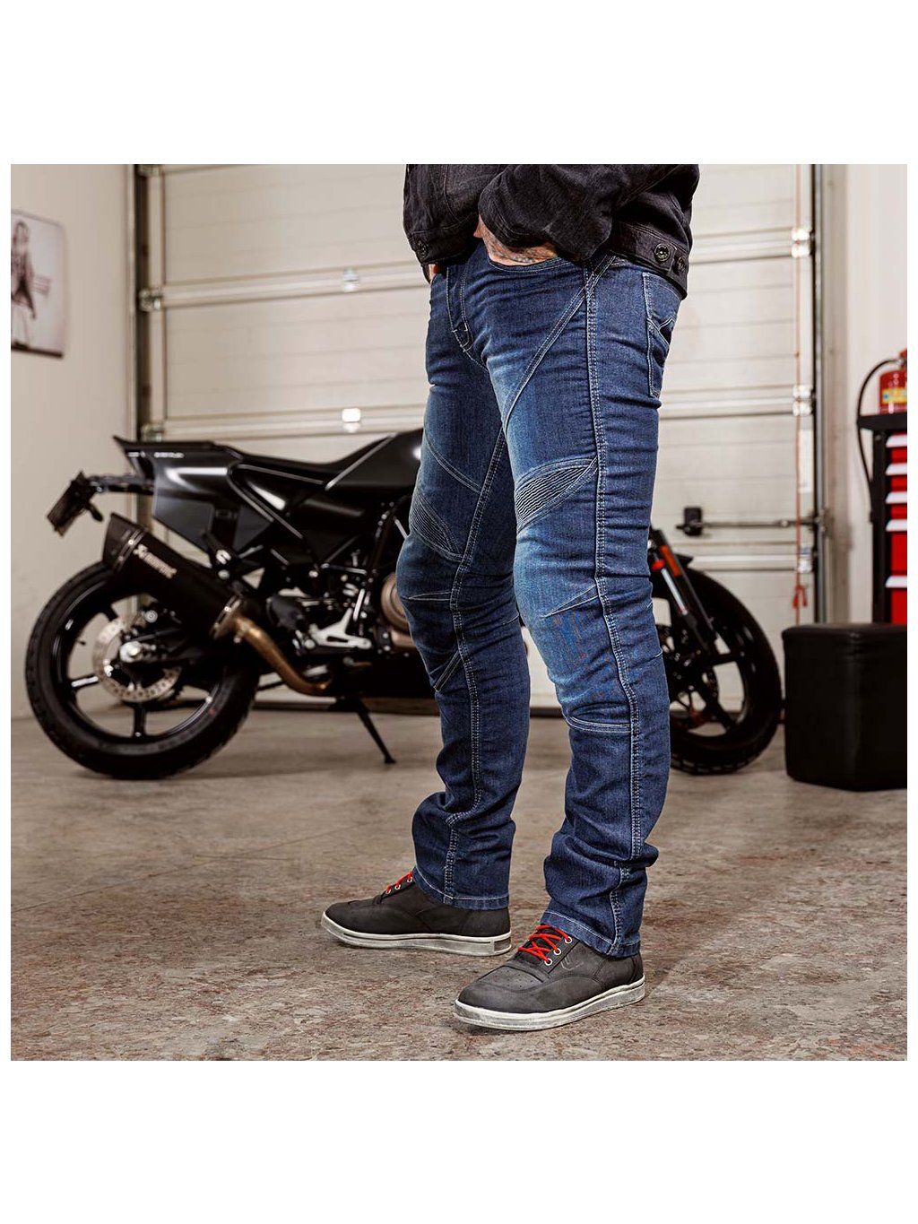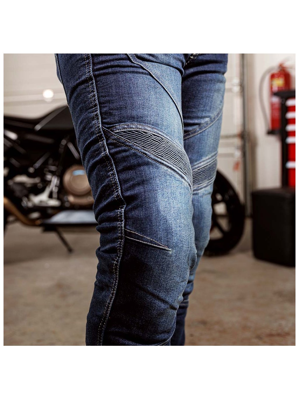 Pro vyšší ochranu džíny disponují vyztužením z aramidového vlákna zabudovaného přímo do denimové tkaniny, a to na hlavních strategických místech. Aramidový materiál je velmi tuhý a chrání látku proti nárazům a oděrům.