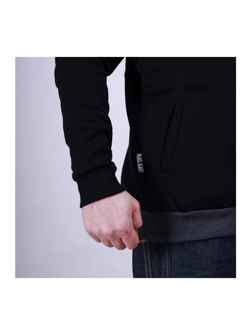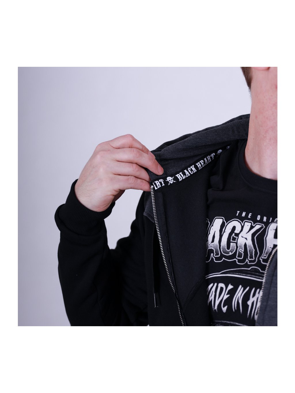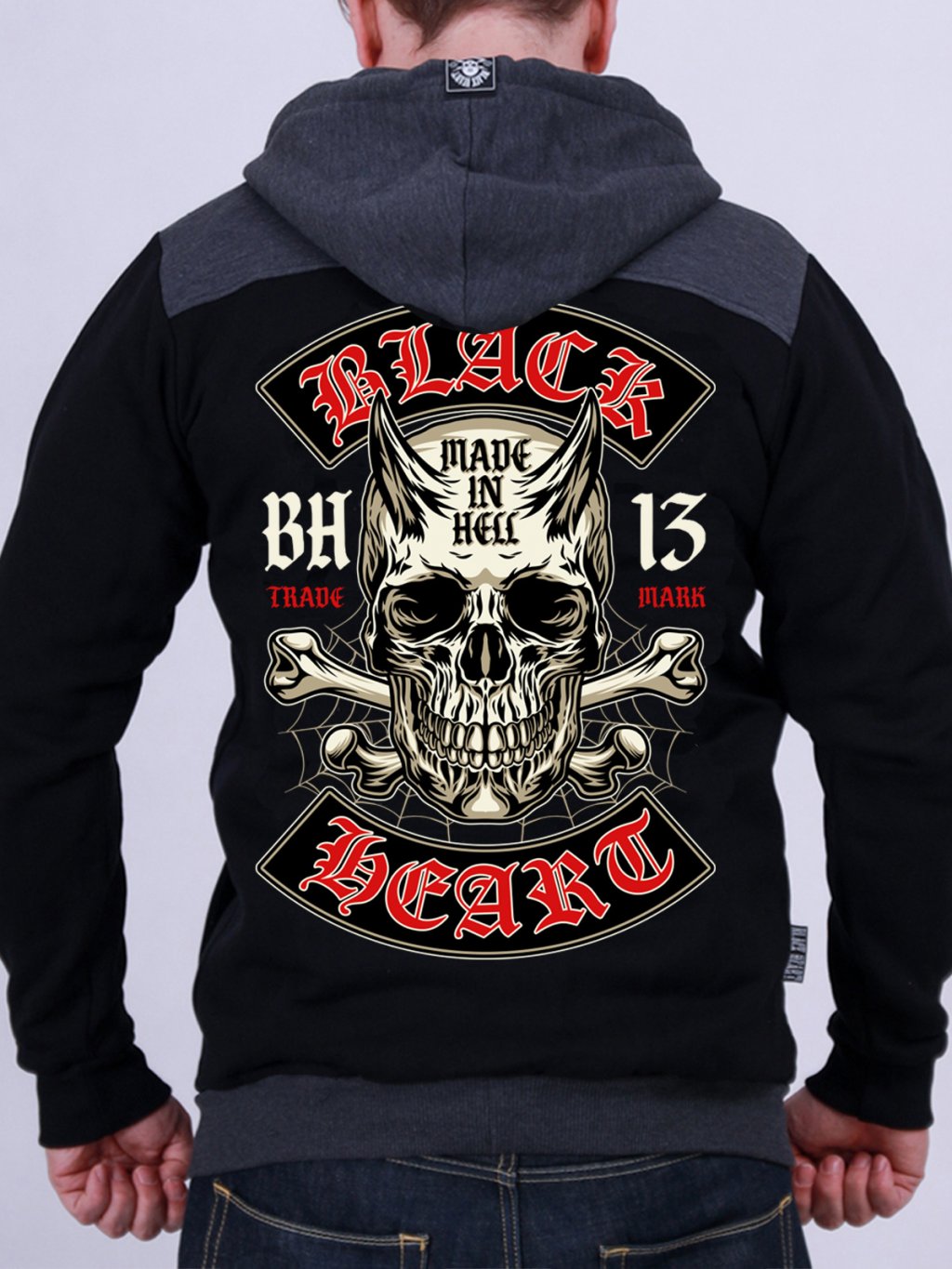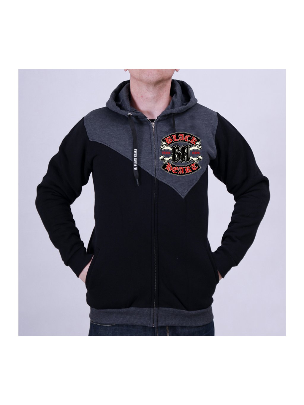 Mikina BLACK HEART s delším rovným střihem je vybavena dvěma kapsami na břiše a v přední části je opatřena celorozepínacím zipem. V neposlední řadě disponuje kapucí, kterou lze velikostně upravit pomocí tkaniček. Ty disponují stejně jako většina ostatních částí mikiny potiskem v rebelském stylu.