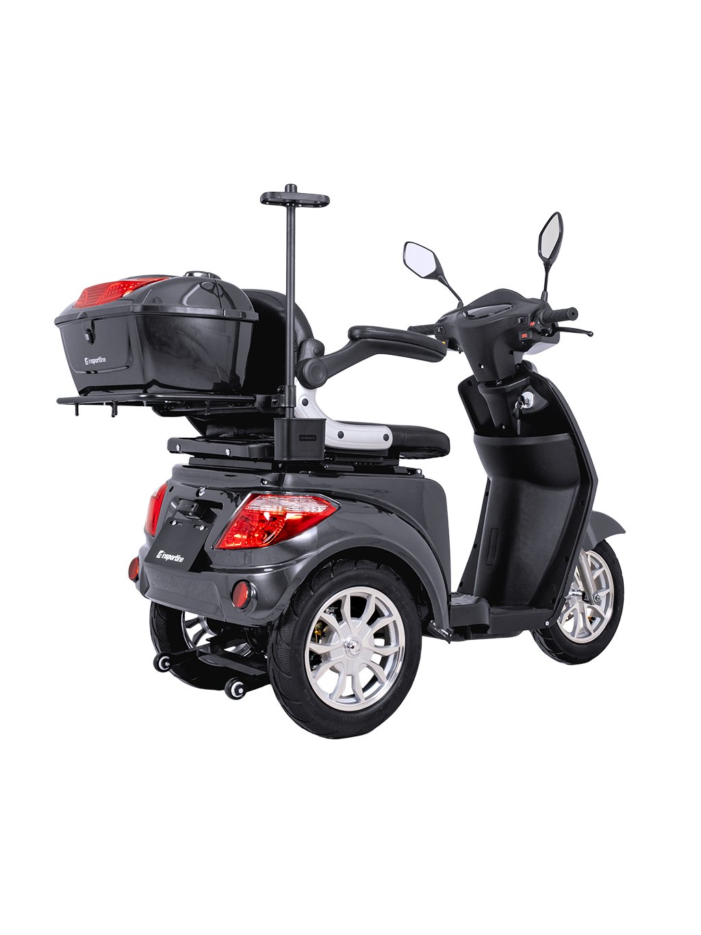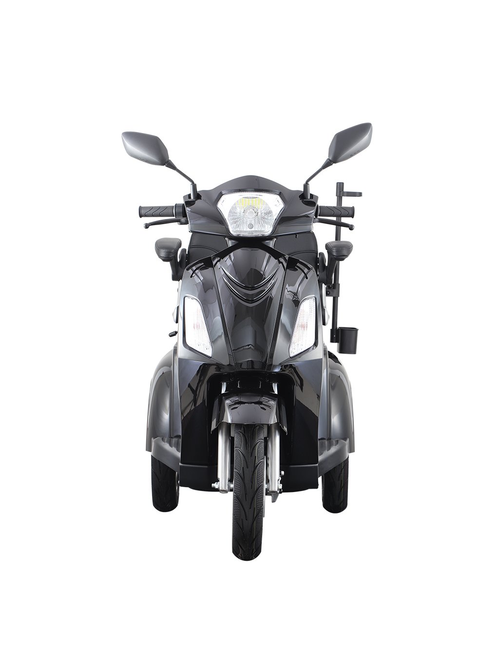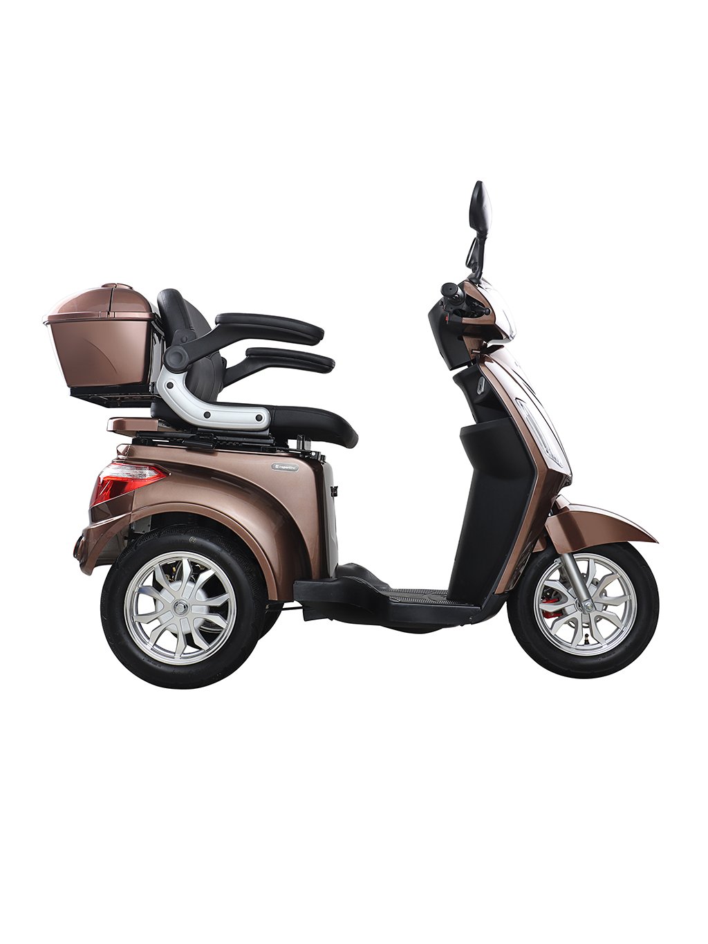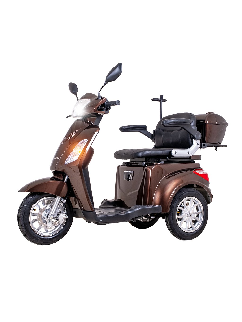 Jelikož se jedná o skútr na elektrický pohon, je provoz stroje tichý a šetrný k životnímu prostředí. Navíc na něj můžete naskočit i bez řidičáku. Sedadlo je pohodlné a díky sklápěcím opěrkám se bez problému pohodlně usadíte, i když jste v pohybu omezeni. V zadní části pak najdete hned 2 úložné prostory, kam v pohodě složíte nákup nebo menší zavazadla. Vozík mimo jiné disponuje hlasitým bezpečnostním alarmem, který ho chrání před zloději.