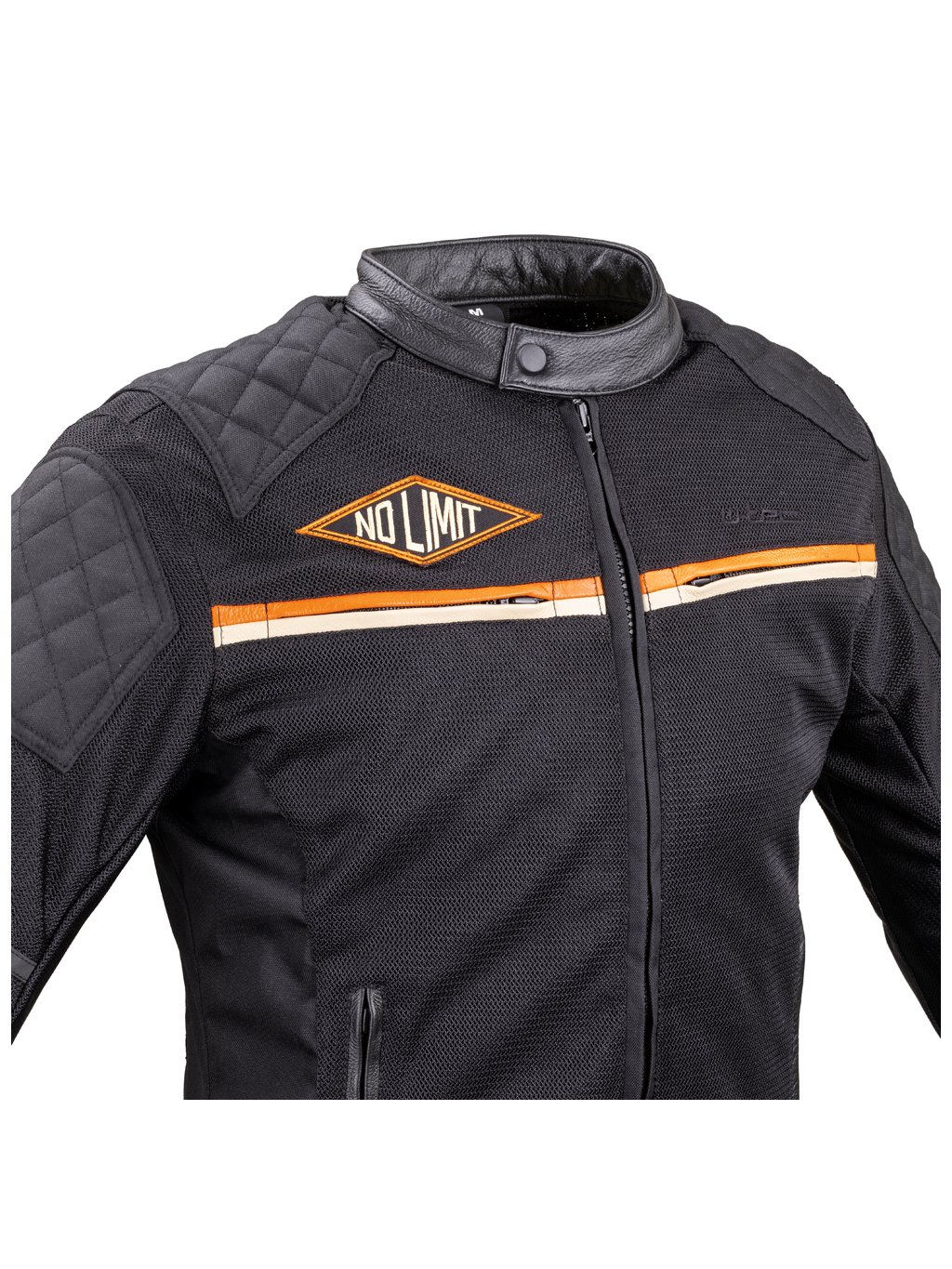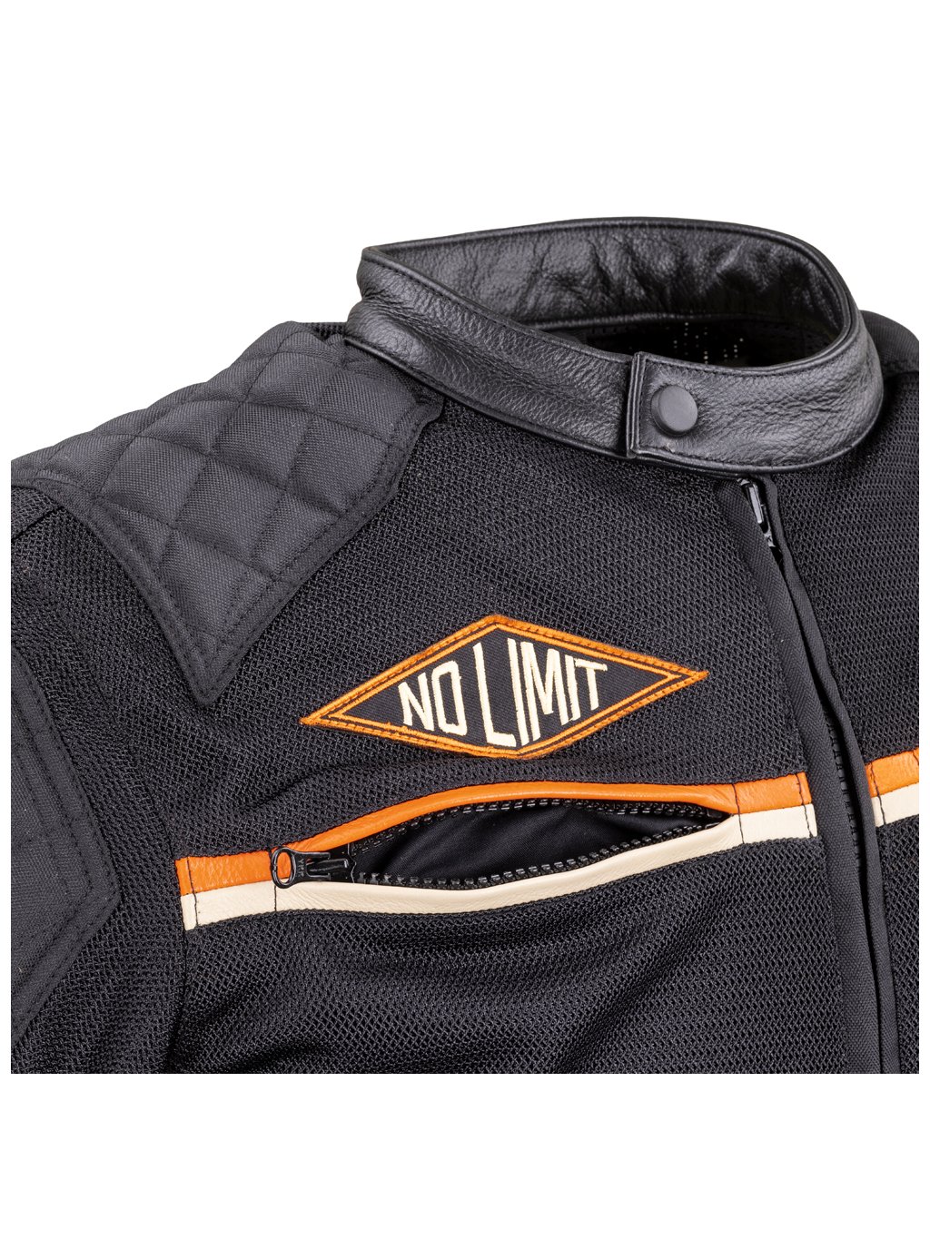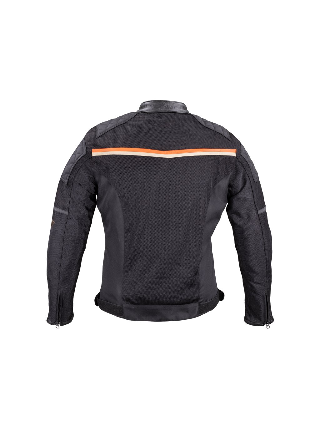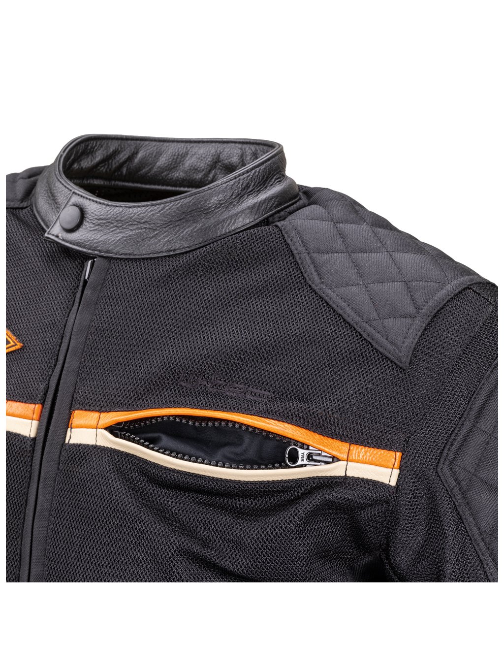 Ta přináší retro vzhled kožené bundy s nášivkami, avšak většinu jejího povrchu tvoří prodyšná síťovina, která má za úkol přivádět co nejvíce čerstvého vzduchu do bundy tak, aby se za horkých letních dní jezdec cítil co nejvíce v pohodě. Na kůži se ovšem nezapomnělo, najdete jí na límci, ozdobných pruzích a lemových částech bundy. Vintage vzhled je pak ještě doladěn elegantně prošívanými panely na ramenou.