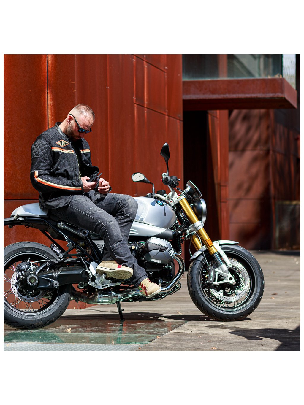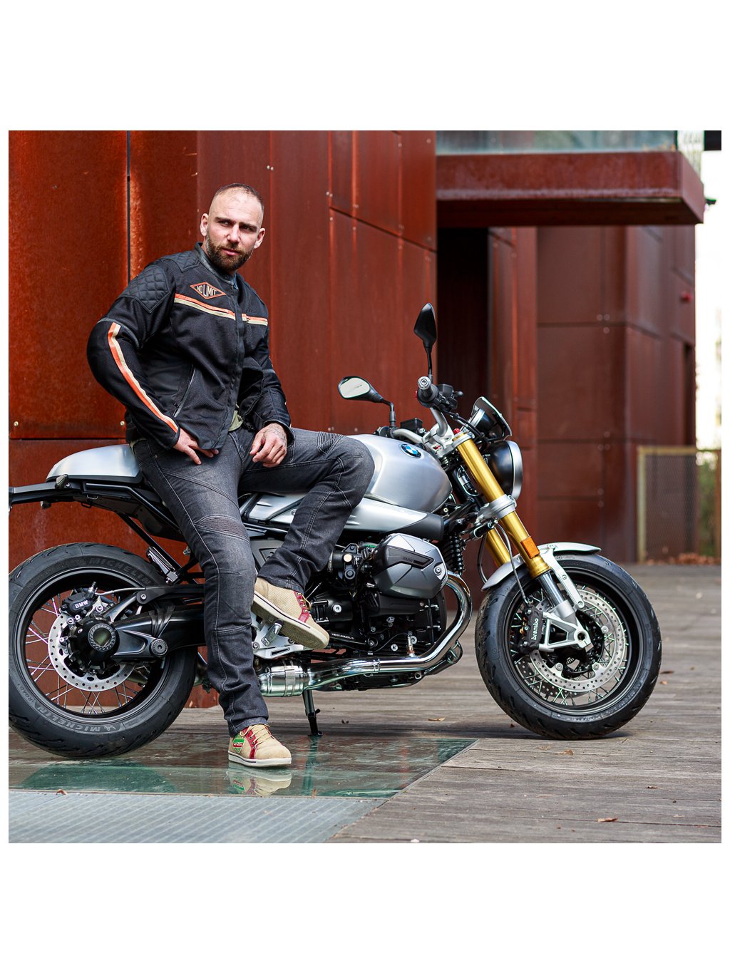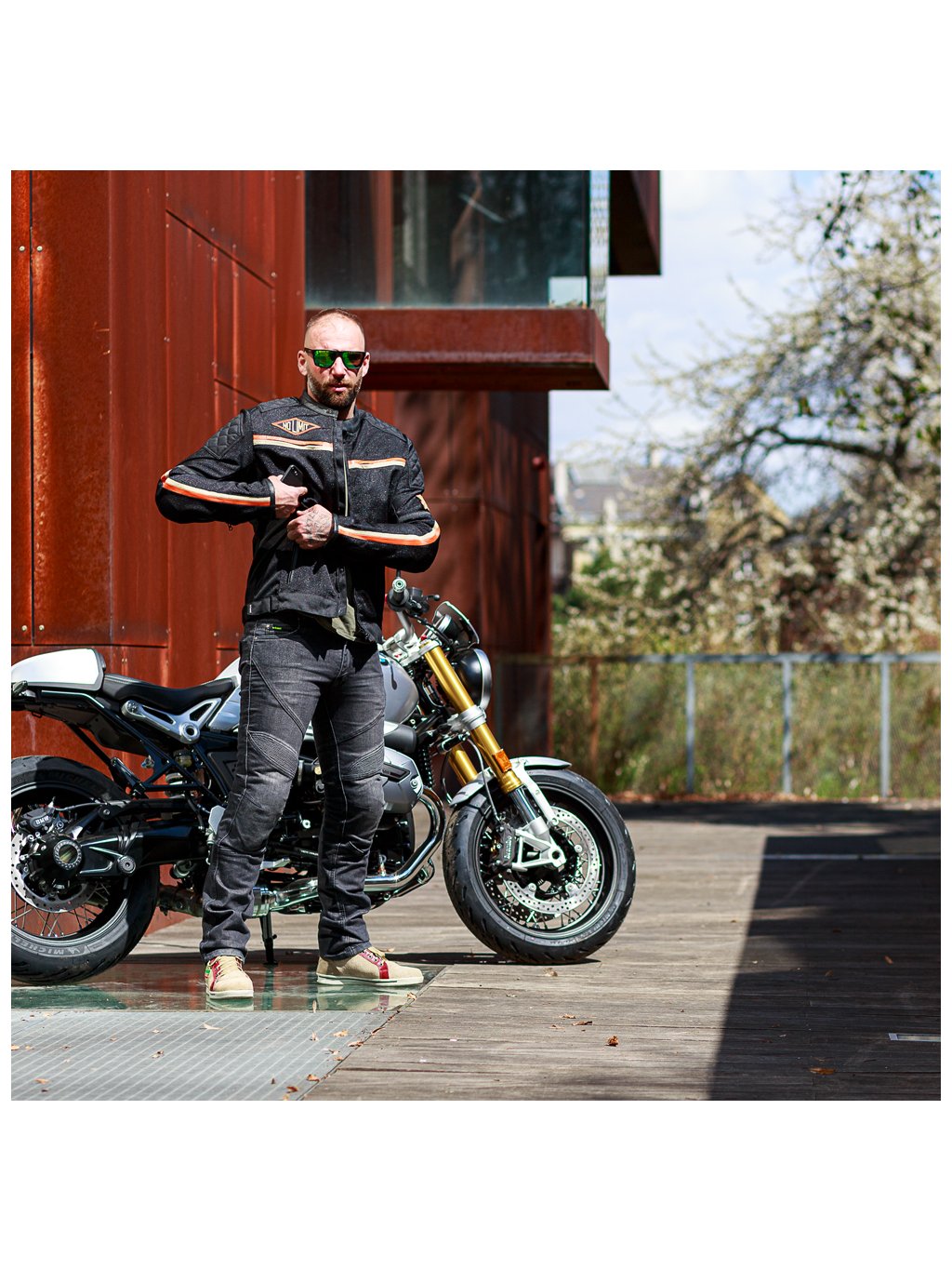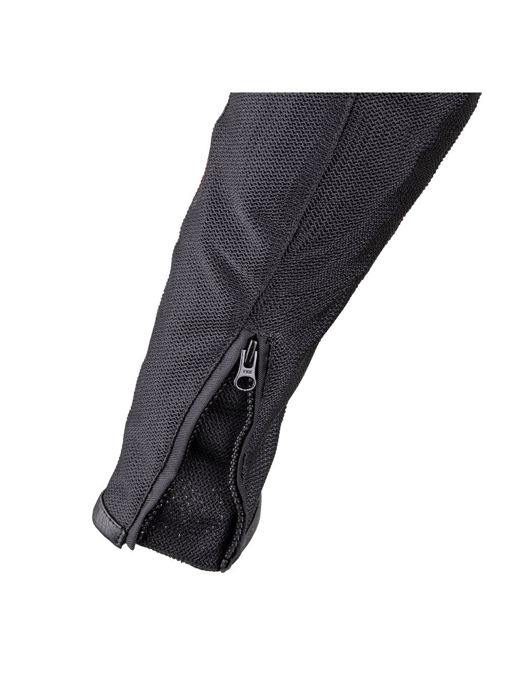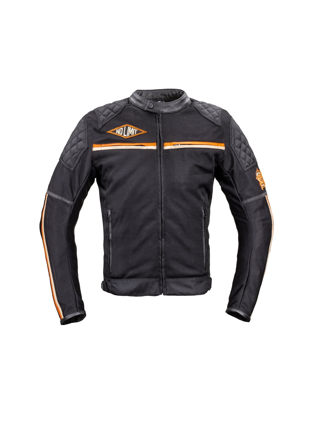 Ta přináší retro vzhled kožené bundy s nášivkami, avšak většinu jejího povrchu tvoří prodyšná síťovina, která má za úkol přivádět co nejvíce čerstvého vzduchu do bundy tak, aby se za horkých letních dní jezdec cítil co nejvíce v pohodě. Na kůži se ovšem nezapomnělo, najdete jí na límci, ozdobných pruzích a lemových částech bundy. Vintage vzhled je pak ještě doladěn elegantně prošívanými panely na ramenou.