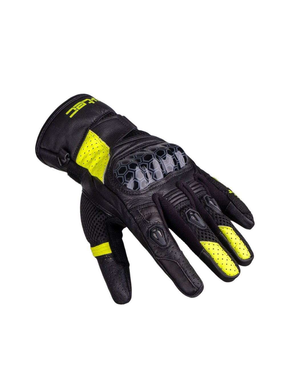Vyrobeny z kozí a hovězí kůže, rukavice nabízejí skvělou odolnost i pružnost, a to jak při krátkých projížďkách, tak při dlouhých cestách. Důraz na detaily je vidět v každém prvku – od dvojité vrstvy kůže na kritických místech dlaně, přes skrytý protektor kloubů, až po pohodlné strečové panely na zápěstí a prstech, které zajišťují neomezený pohyb.