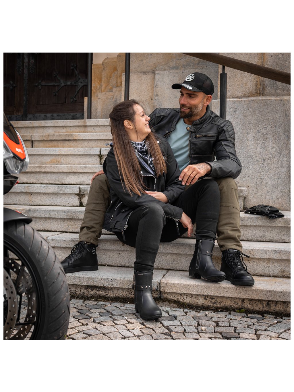 Každý prvek má svůj důvod - vyztužená pata pro jistotu při došlapech, gumová ochrana kotníků při nečekaných situacích a dvojité švy, které odolají opotřebení. Zesílená protiskluzová podrážka vás podrží na mokré dlažbě i rozpáleném asfaltu, zatímco perforovaná pěnová vložka udrží komfort i během dlouhých dnů v sedle. A díky podšívce z pravé kůže získáváte nejen měkkost a příjemný kontakt s nohou, ale také přirozenou regulaci vlhkosti a teploty - jen čisté pohodlí. Nasazují je rychle díky praktickému poutku a tkaničky si doladíte přesně podle svého stylu.