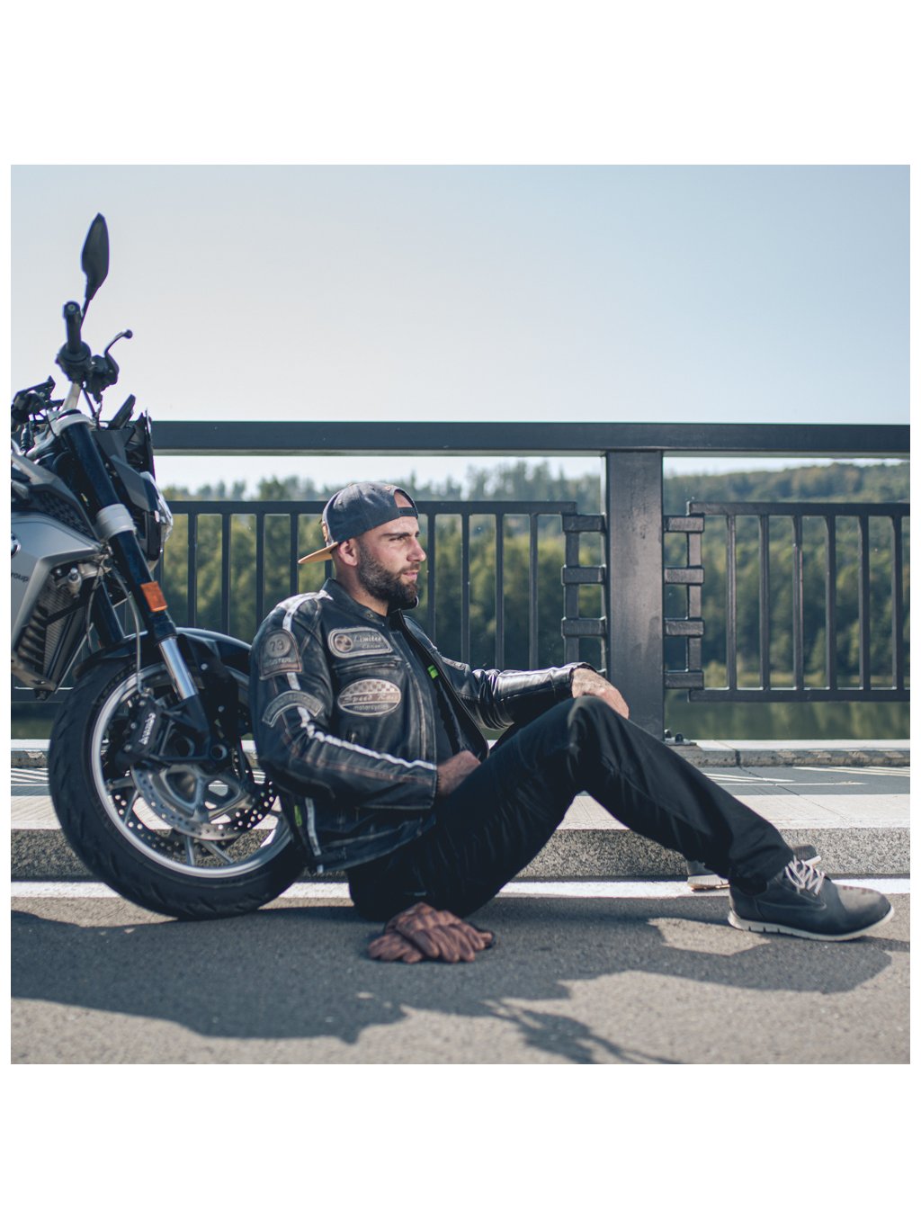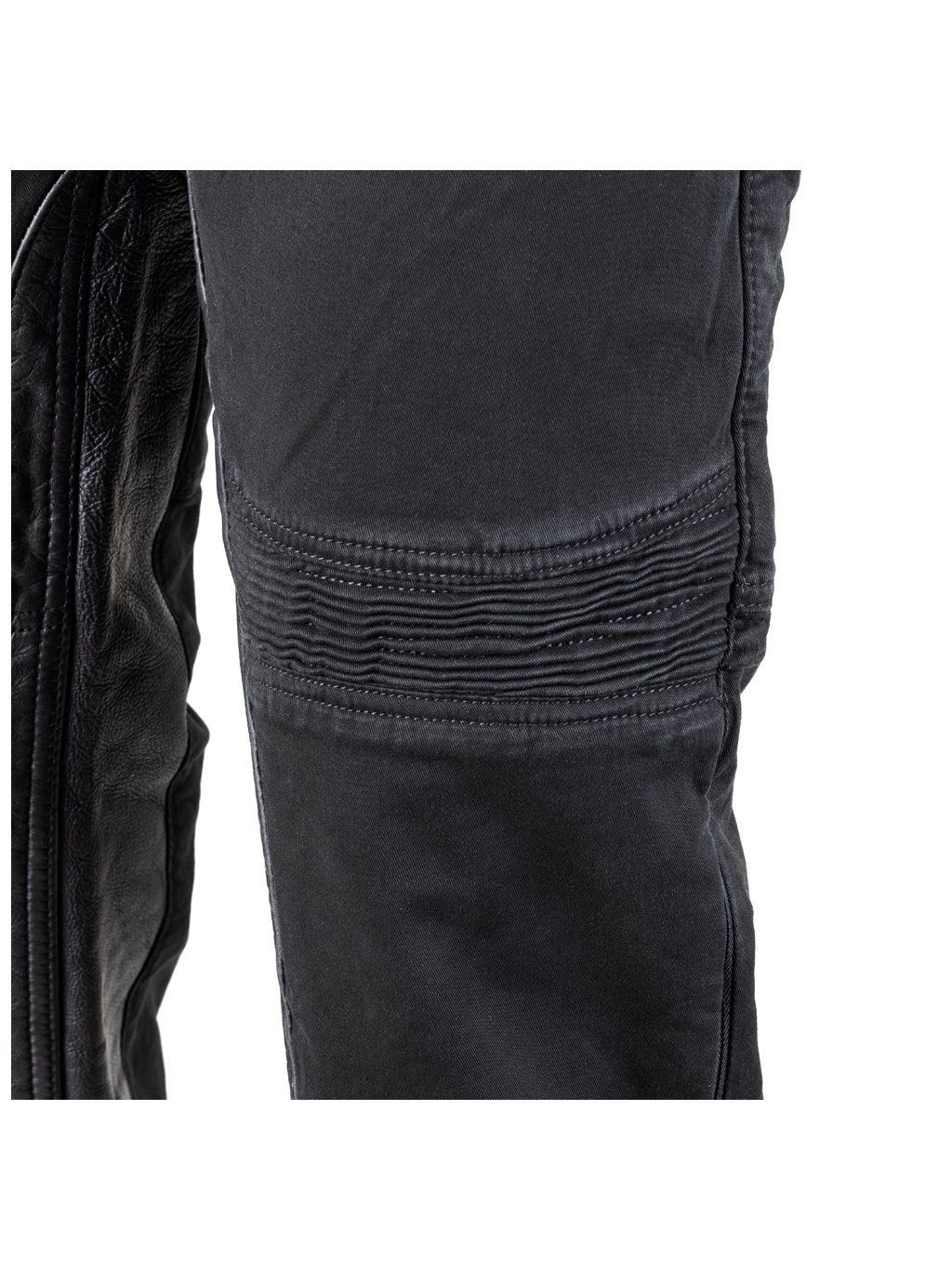 - materiál: vnější 11,5 oz bavlněná tkanina (98%), elastan (2%), kůže; podšívka 60% aramid 40% polyester (na cca 60% povrchu)