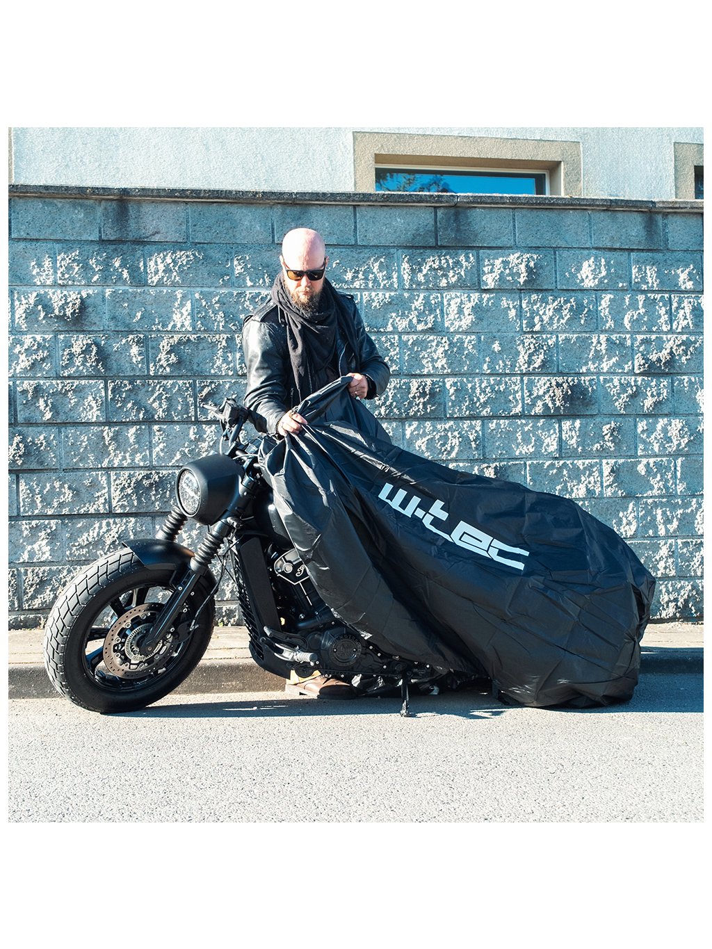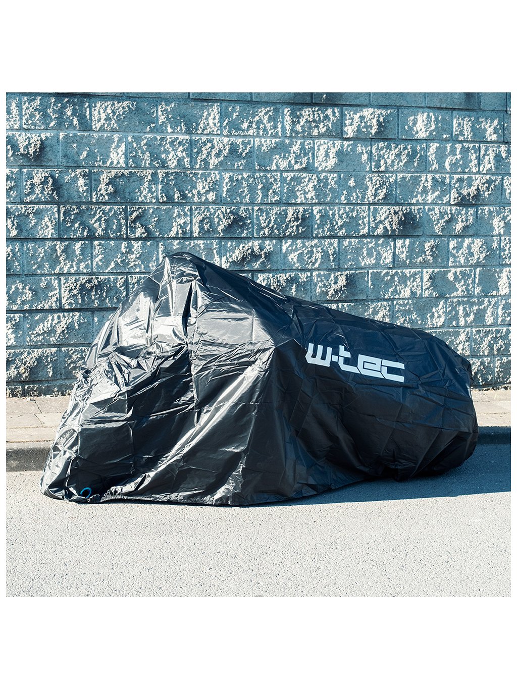 Chraňte svůj motocykl před nepříznivými vlivy pomocí vodoodpudivého ochranného potahu W-TEC Covertura - slouží jako kryt proti dešti, sněhu, větru, slunečním paprskům a prachu. Díky elastické manžetě na dolním okraji je zamezeno odfouknutí plachty z motocyklu.