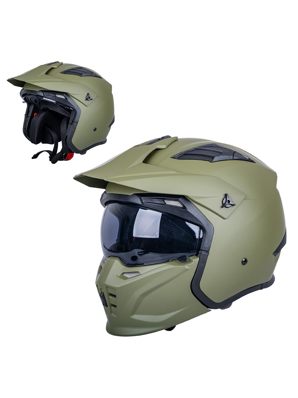 Přilba W-TEC Badalone je modulární 3v1 moto helma se snadno odnímatelnou bradovou částí. Využijete jí jako otevřenou přilbu pro jízdu na skútrech a dalších městských motocyklech, vzít si jí můžete i na výlety a dobrodružství v terénu. Pro tento účel je vybavena demontovatelným kšiltem. Ve verzi Army přichází tato přilba v poutavých vojenských barvách.