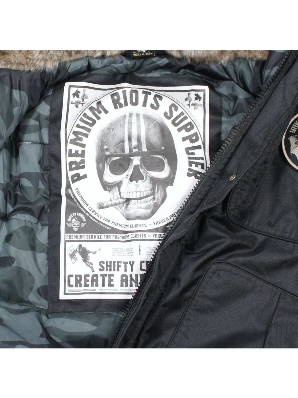 Limitovaná edice zimní bundy 3765 v černé barvě od Yakuza Premium pro muže. Tato bunda nejenže hřeje, ale také vypadá neuvěřitelně stylově. Má kapuci s odnímatelným kožešinovým límcem. Na levé straně hrudi je odnímatelný suchý zip. Na zadní straně bundy je velké vyšívané logo Yakuza Premium. Tuto zimní bundu dělá výjimečnou díky četným detailům. Na levém rukávu má decentní kapsu, čtyři přední kapsy a jednu vnitřní kapsu. Na pravém rukávu je také výšivka. Bunda má poměrně volný střih a odpovídá velikosti. Manžety také udržují teplo na místě. Množství je omezené, takže zkušenosti ukazují, že bundu lze zakoupit pouze krátkou dobu. Více informací o produktu naleznete na obrázcích. Materiál: 100% polyester - vyrobeno v Číně.
